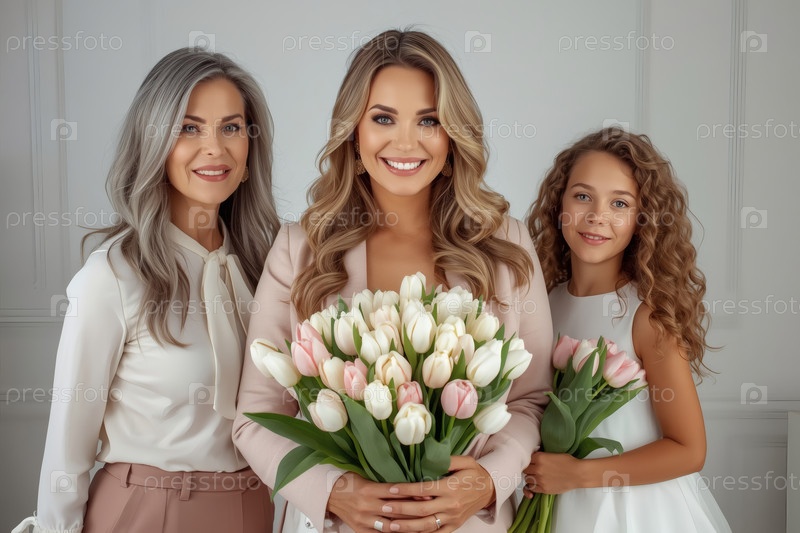 Концепция праздника, посвященного Международному женскому дню 8 марта.Три поколения женщин.Молодая женщина, несущая букет тюльпанов, в сопровождении пожилой матери и маленькой дочери