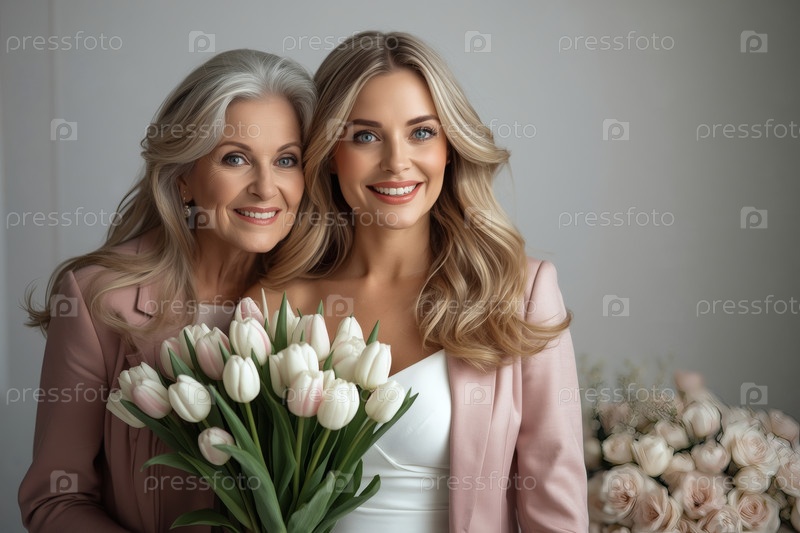 Концепция праздника, посвященного Международному женскому дню 8 марта.Два поколения женщин.Молодая женщина с букетом тюльпанов в сопровождении пожилой матери