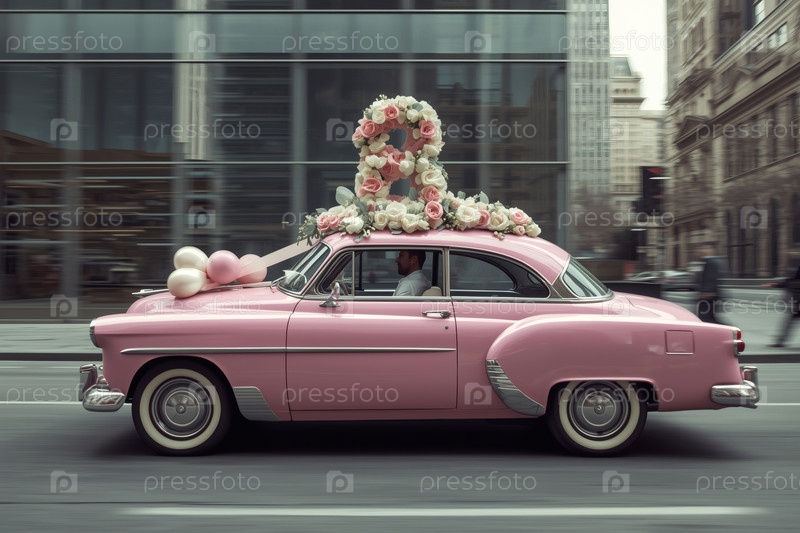 Концепция праздника Международного женского дня 8 марта.Розовый ретро-автомобиль с цветной аранжировкой в форме восьмерки на крыше, движущийся по улице города среди небоскребов