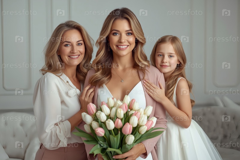 Концепция праздника, посвященного Международному женскому дню 8 марта.Три поколения женщин.Молодая женщина, несущая букет тюльпанов, в сопровождении пожилой матери и маленькой дочери