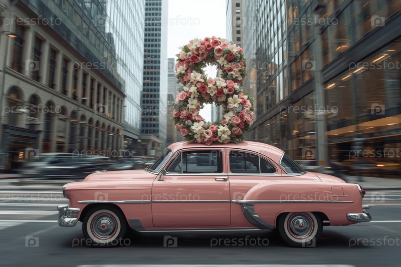 Концепция праздника Международного женского дня 8 марта.Розовый ретро-автомобиль с цветной аранжировкой в форме восьмерки на крыше, движущийся по улице города среди небоскребов