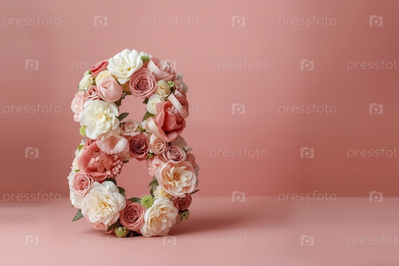 Международный женский день. баннер, флаер, красивая открытка к празднику 8 марта. цветы в форме цифры восемь и бабочки на розовом фоне