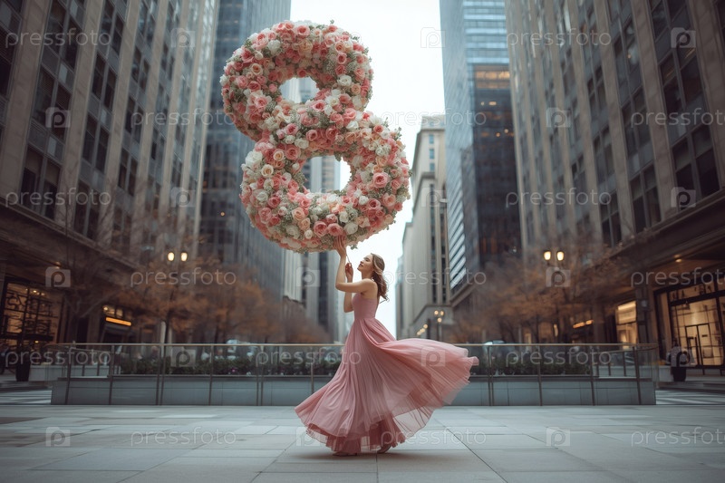 Концепция праздника, посвященного Международному женскому дню 8 марта.Женщина в розовом платье держит огромную цветочную восьмерку на городской улице, окруженной небоскребами