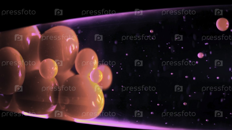 Лава лампа на черном фоне. Концепция. Близкий план светящихся неоновых пузырей лавовой лампы, двигающихся горизонтально. Красивые яркие пузыри со световым освещением неонной лавовой лампы. Ретро декор