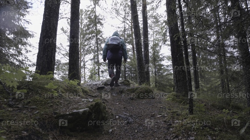 Обратный взгляд на туриста с рюкзаком, поднимающегося по скалистой тропе в горном лесу, концепция приключений и походов
