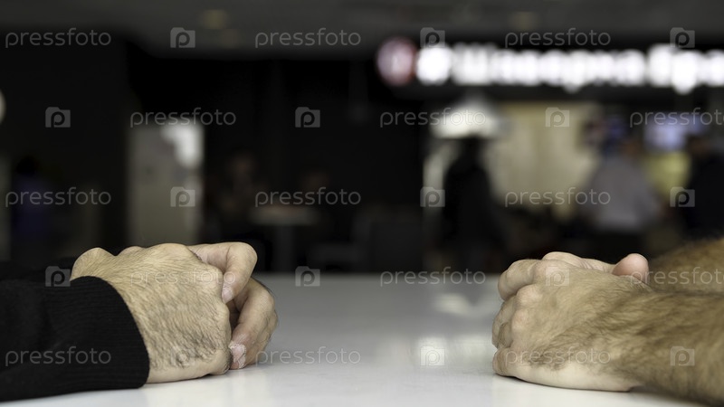Закрытие стола и руки двух мужчин, ведущих интервью или диалог