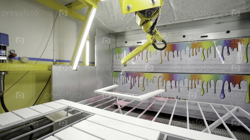 Индустриальная роботизированная рука красит раму. Действие. Современное оборудование для покраски мебели на промышленном предприятии. Роботизированная рука красит распыляемый деревянный каркас в розовом цвете