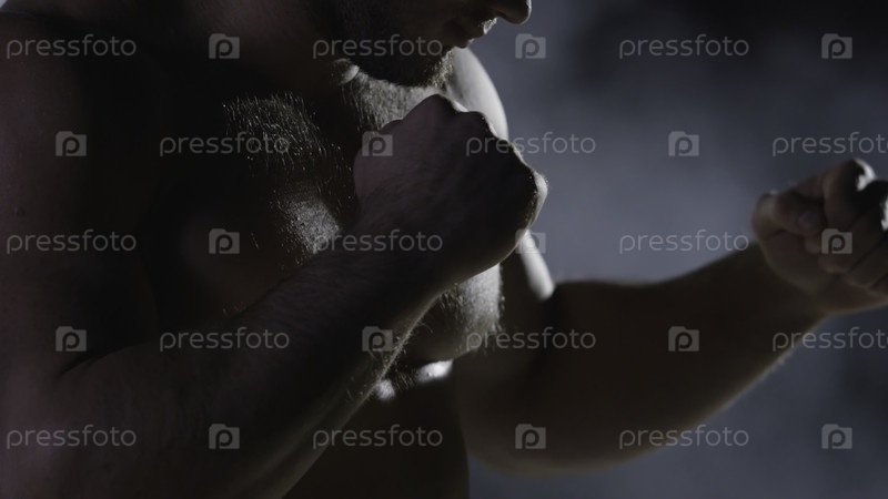 Боксер с сильными руками и зажатыми кулаками на черном фоне. Близкий план руки бокса, готового к бою