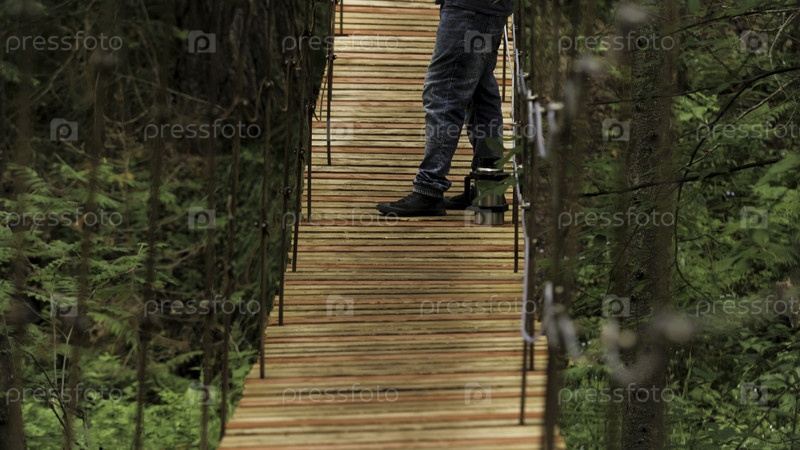 Боковой вид человека, стоящего на деревянном висячем мосту и курящего трубку, наблюдая издалека