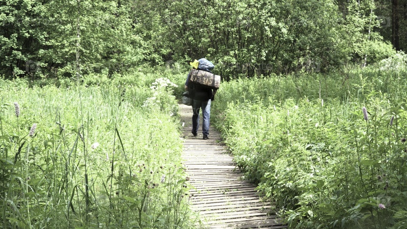 Сзади изображение мужчины с тяжелым рюкзаком, идущего по набережной через зеленое травяное поле