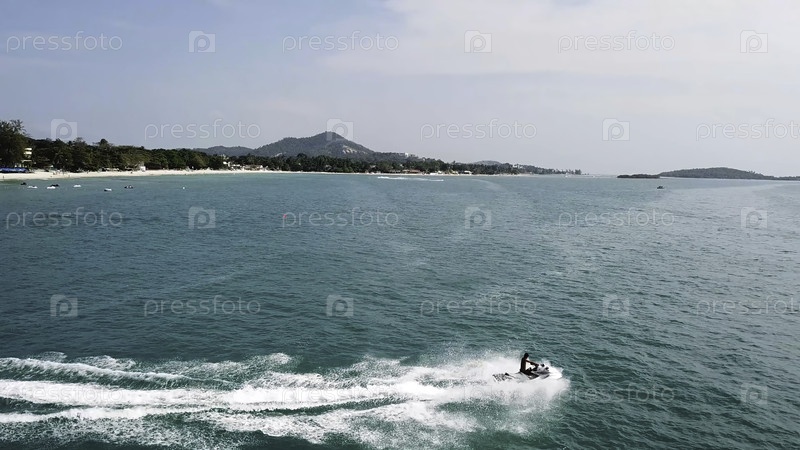 Человек катается на реактивных лыжах. Вид с воздуха Человек катается на реактивных лыжах в море. Реактивные лыжи на морской воде. Человек ездит на водном велосипеде jetski. Концепция путешествия. Люди играют на реактивных лыжах в море. Вид сверху