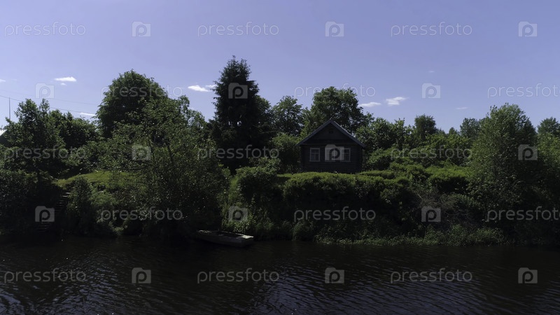 Летний сельский пейзаж с деревянным домом возле озера. Снимок. Солнечный день в русской деревне с маленьким домиком, окруженным деревьями и кустарниками на фоне голубого неба