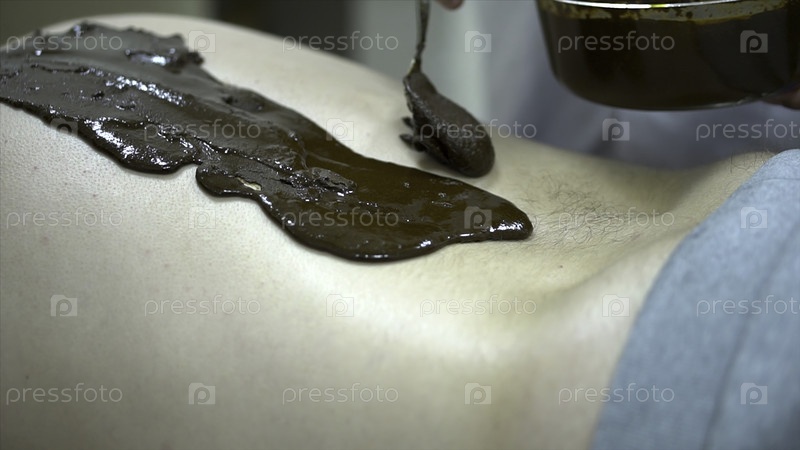 Закрытие для пациента, лежащего в постели с горячей терапевтической грязью на спине и концепцией альтернативной медицины