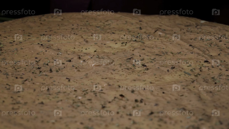 Руки, готовящие пиццу. Рамка. Кухарь на кухне кладет ингредиенты на пиццу. Концепция пиццы. Производство и доставка продуктов питания. Клюсовая рука шеф-повара пекаря в белой форме, делающего пиццу на кухне