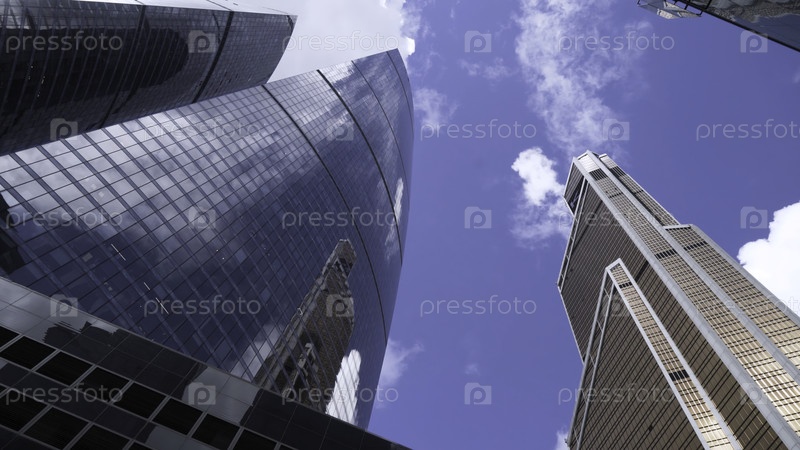 Вид снизу стеклянных небоскребов на фоне синего неба. Действие. головокружительный вид бизнес-высотки в центре современного города. Стеклянные небоскребы отражают голубое небо