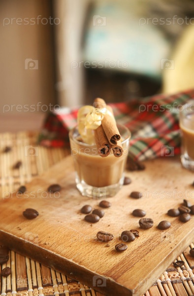 Алкогольный ликер с корицей и кофейными зернами на столе. Крупный план. Напитки и кулинария