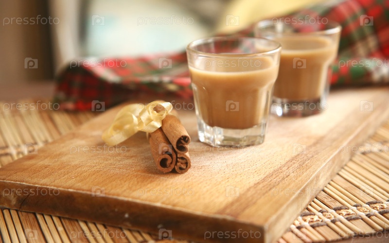 Алкогольный напиток ликер с корицей и кофейными зернами на столе. Крупный план