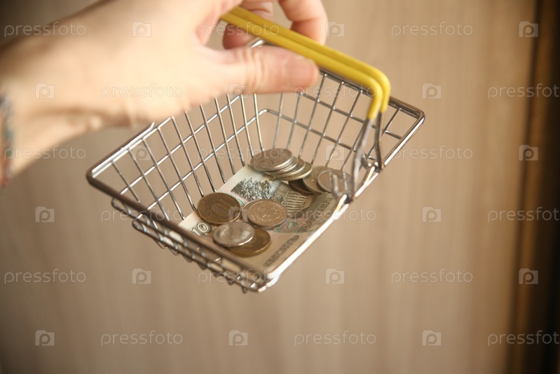 Маленькая корзинка для покупок с рублями и монетами в женской руке. Финансы и экономика