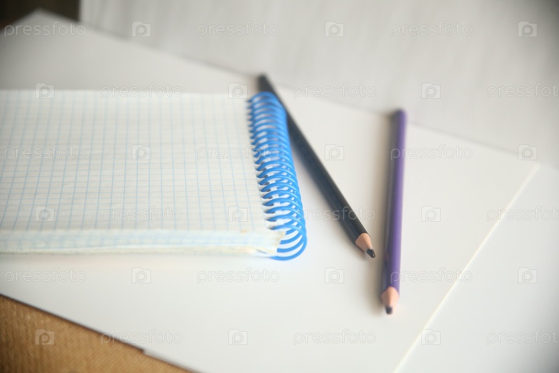 Школьные канцелярские товары карандаши и блокнот на белом фоне