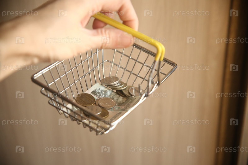 Рука держит маленькую корзину для покупок с деньгами рублями. Финансы и валюта