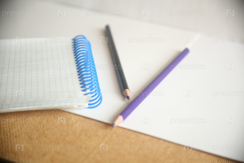 Школьные канцелярские товары карандаши и блокнот на белом фоне