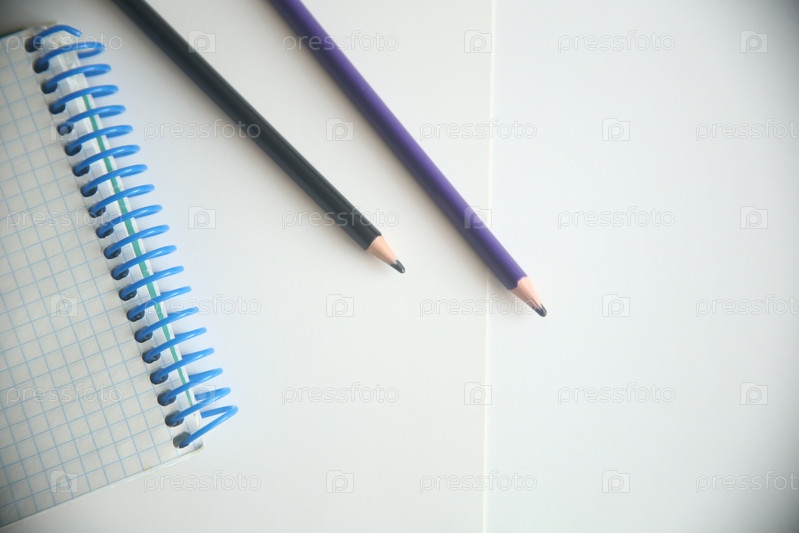 Школьные канцелярские товары карандаши и блокнот на белом фоне
