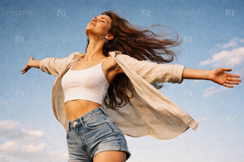 Молодая женщина на фоне голубого неба, простирающая руки в знак свободы летний образ жизни-портрет в белом топе, джинсовых шортах и легкой рубашке, ветер в волосах