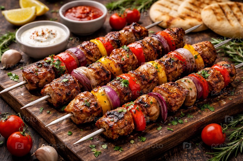 Шашлык из курицы с болгарским перцем и красным луком на металлических шампурах, подача на деревянной доске с чесночным и томатным соусами, помидорами черри и свежей зеленью