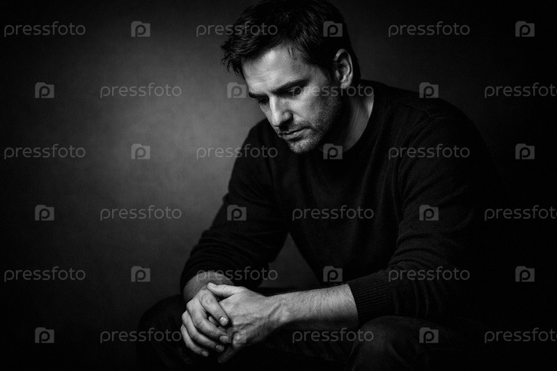 Черно-белая студийная фотография задумчивого мужчины в темном свитере, сидящего в пол-оборота с сомкнутыми руками и драматическим низкоконтрастным освещением