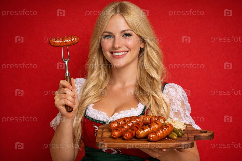Модель в баварском дирндле держит деревянную разделочную доску с горячими жареными колбасками (братвурст), маринованными огурцами и квашеной капустой; в другой руке — вилка с колбаской на насыщенном красном фоне, тематическая фуд-фотография в стиле Октобе