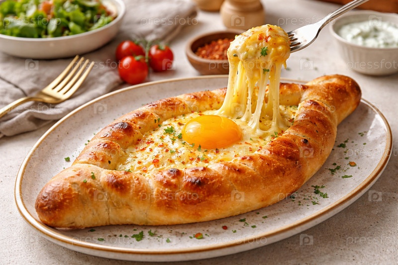 Аджарский хачапури с расплавленным сыром и яйцом в центре на тарелке, золотистая хрустящая корочка, крупный план, подача с зеленью и помидорами