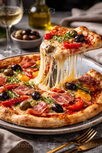 Аппетитный крупный план итальянской пиццы: ломтик с тянущимся сыром моцарелла, прошутто, черными и зелеными оливками, красными и желтыми черри-помидорами и веточками тимьяна на хрустящей тонкой корочке, сервировка с оливковым маслом и бокалом белого вина