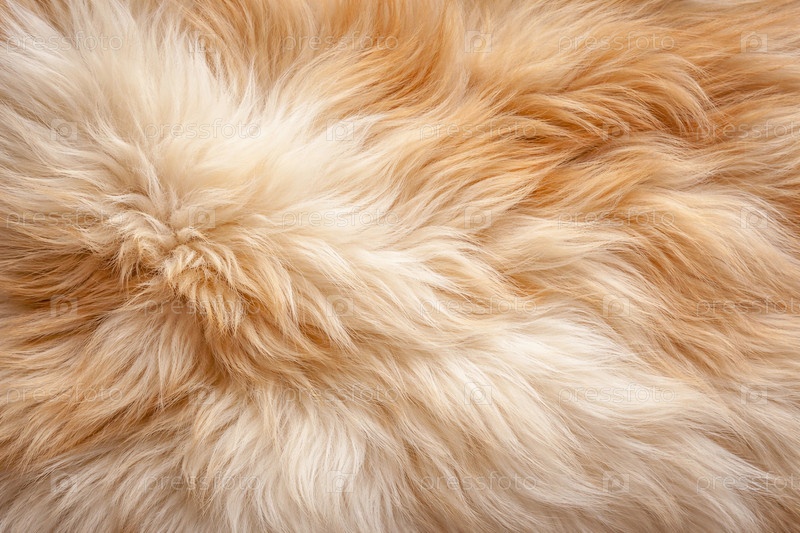 Крупный план кремовой пушистой овчины с длинным ворсом — текстура мягкого мехового коврика для уютного интерьера