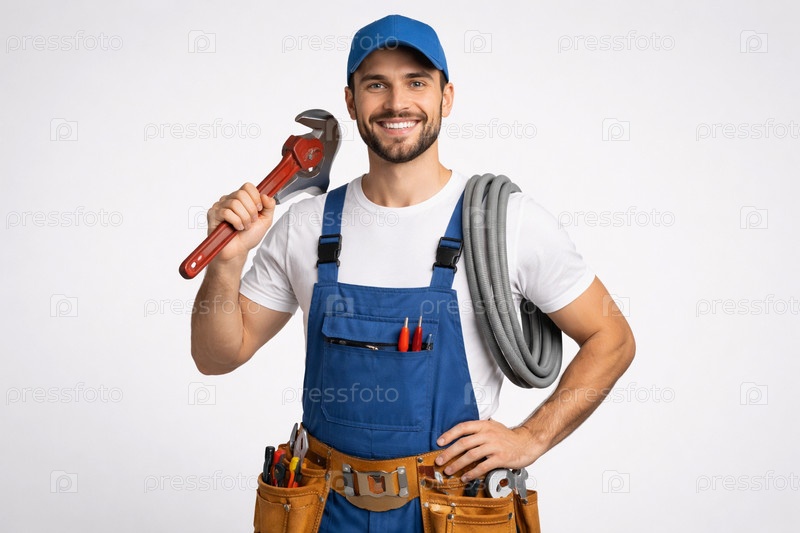 Профессиональный сантехник в синем комбинезоне с разводным ключом на плече, инструментальным поясом и гибким шлангом на белом фоне
