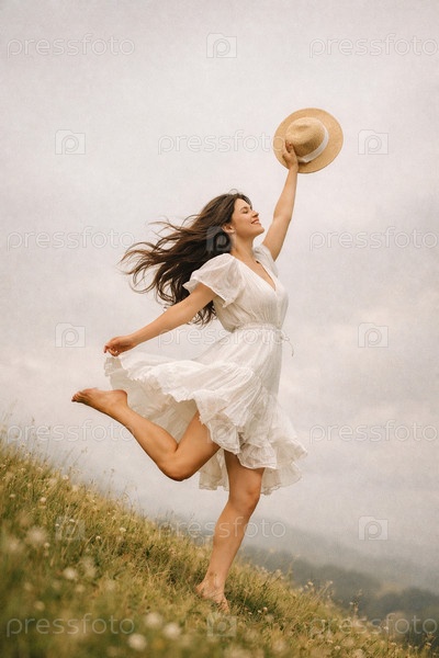 Молодая женщина в легком белом платье и соломенной шляпе прыгает босиком по цветущему лугу, наслаждаясь ветреным летним днем и ощущением полной свободы
