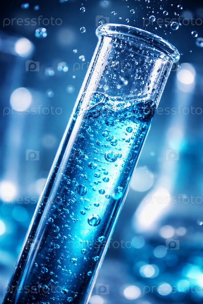 Макрофотография стеклянной пробирки с насыщенно‑синим раствором и пузырьками воздуха на размытом лабораторном фоне — химический эксперимент и научные исследования