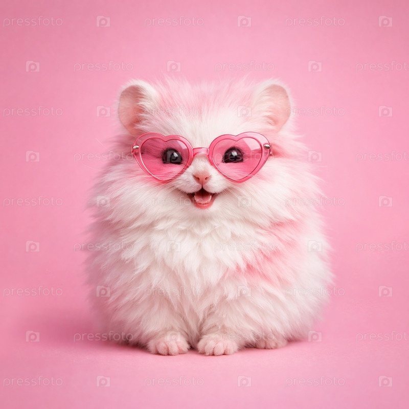 Портрет пушистого бело-розового зверька в розовых солнцезащитных очках в форме сердца на однотонном розовом фоне, студийное стоковое фото для праздничных и романтических концепций
