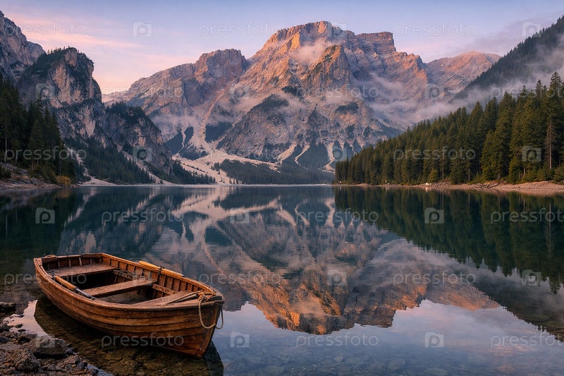 Утреннее спокойствие на горном озере: деревянная лодка у берега, зеркальное отражение скалистых вершин и елового леса в мягком золотом свете рассвета