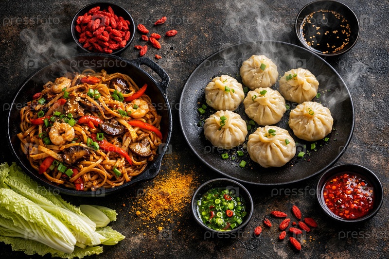 Азиатский обед на темном фоне: лапша вок с креветками и овощами и паровые пельмени баоцзы (сяо лун бао) с соусами и специями, вид сверху