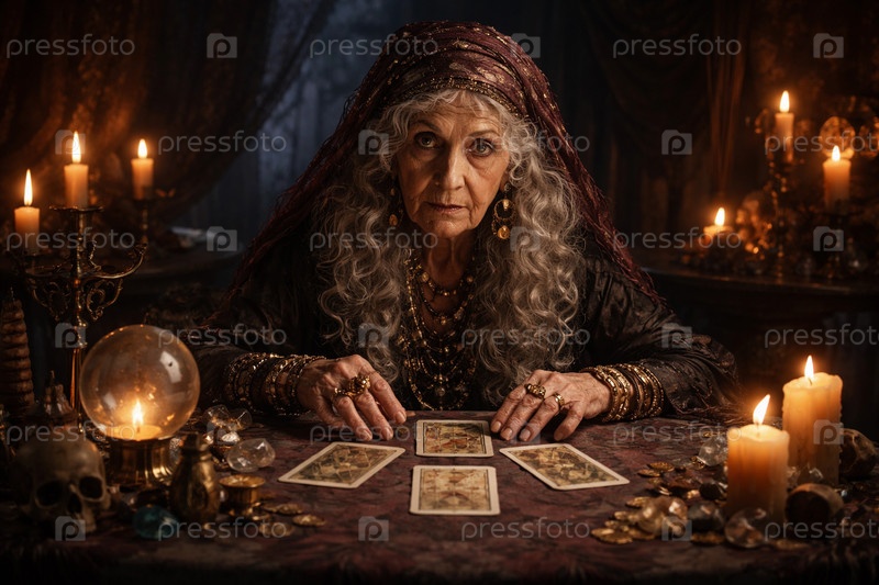 Таинственная гадалка в мрачном интерьере раскладывает карты Таро на столе при свечах, хрустальный шар, эзотерика и предсказание судьбы