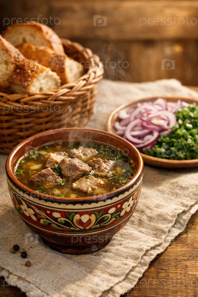 Горячий наваристый мясной суп в расписной керамической миске, парящий бульон с кусочками говядины, рядом корзина со свежим хлебом и тарелка с красным луком и зеленью на деревенском столе