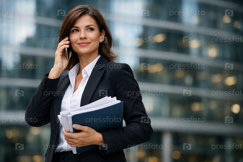 Деловая женщина в костюме разговаривает по смартфону и держит папку с документами на фоне современного офисного здания