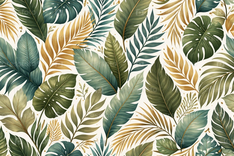 Сочная бесшовная иллюстрация тропических листьев в зелено‑золотой палитре — декоративный ботанический паттерн для обоев, текстиля и фоновой графики
