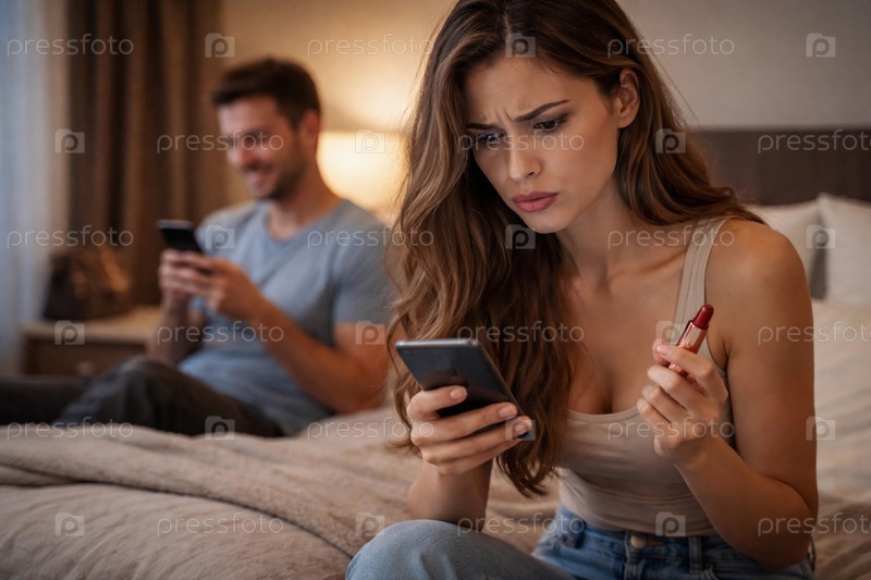 Молодая женщина в спальне держит помаду и смотрит в смартфон, мужчина на заднем плане пользуется телефоном — домашняя вечерняя сцена молодой пары
