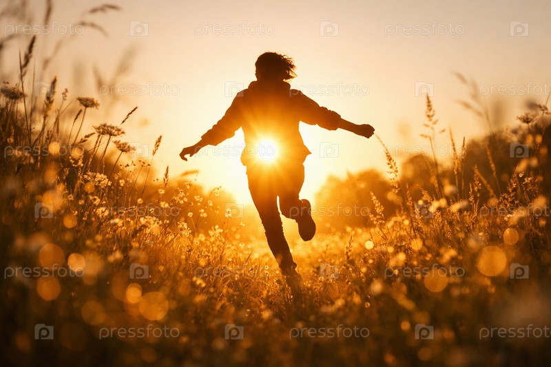 Силуэт человека, бегущего по цветущему летнему полю навстречу золотому закату — контровое освещение, боке и ощущение свободы и радости