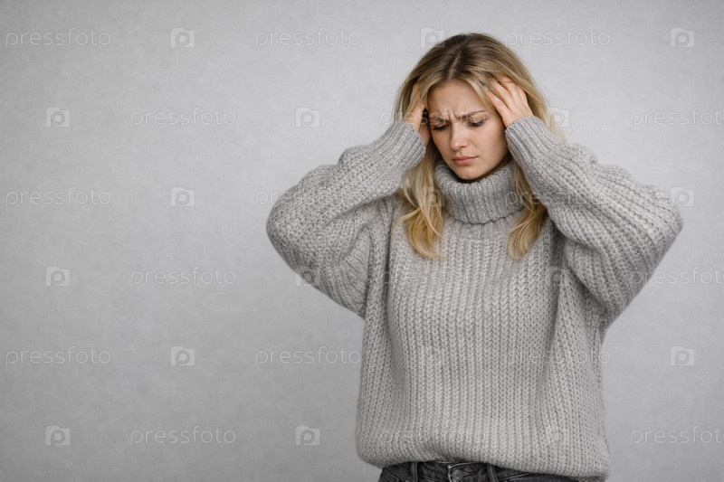 Женщина в теплом сером вязаном свитере, держащая руки у головы, на нейтральном сером фоне — студийный эмоциональный портрет с местом для текста