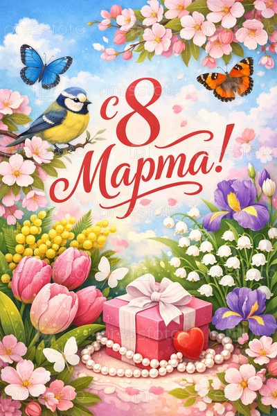Праздничная иллюстрация к 8 Марта с весенними цветами (тюльпаны, мимоза, ландыши, ирисы), подарочной коробкой с бантом и жемчугом, сердечком, бабочками и синичкой на фоне голубого неба