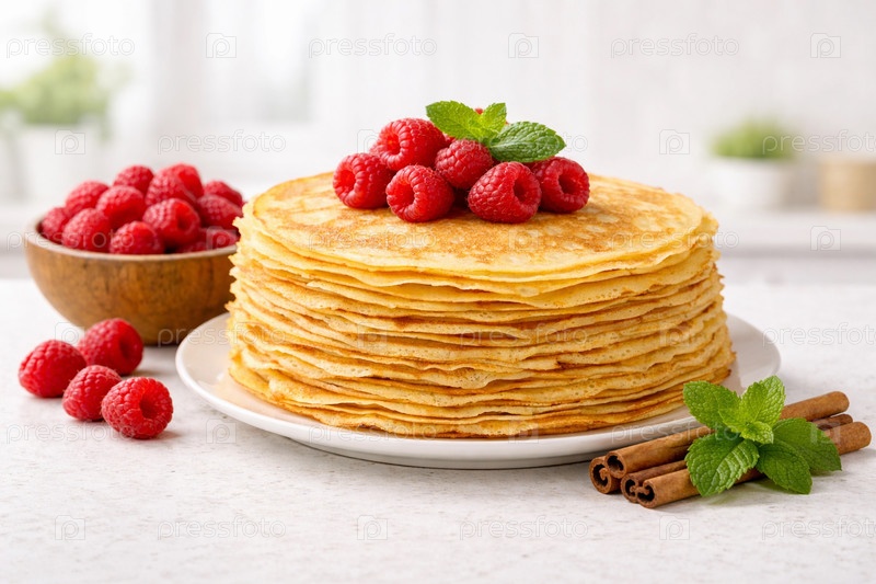 Стопка тонких блинчиков (крепов) на белой тарелке, украшенная свежей малиной, веточкой мяты и палочками корицы — домашний праздничный завтрак на светлой кухне