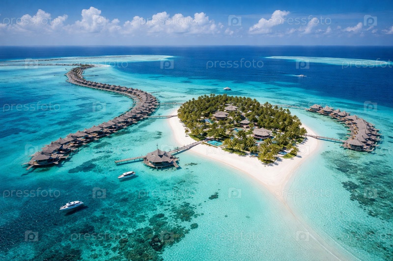 Аэрофотоснимок тропического островного курорта на Мальдивах: белоснежный пляж, пальмы, бирюзовая лагуна и извилистая линия водных бунгало над коралловой отмелью с пришвартованными яхтами