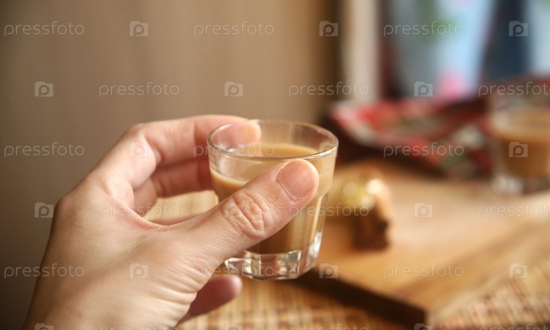 Алкогольный напиток ликер в руке человека. Крупный план. Напитки и кулинария